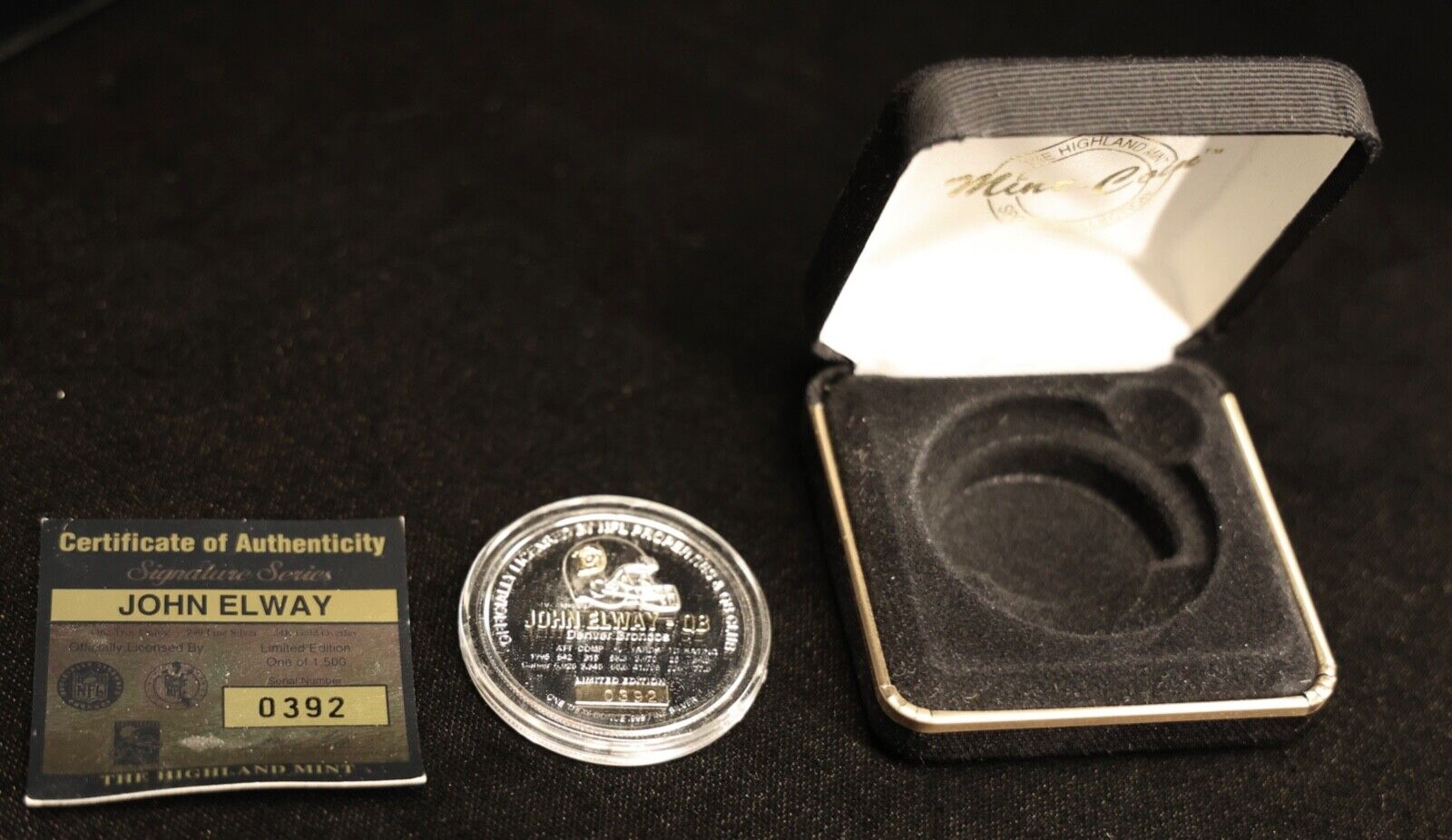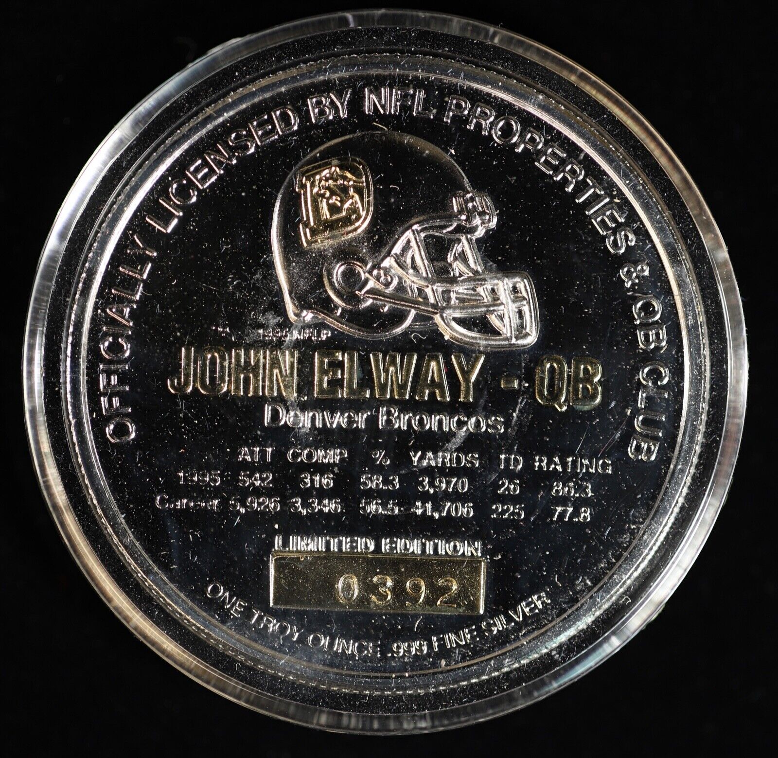 For sale is a John Elway #7 Broncos Football 1 oz .999 Pure Silver Round Highland Mint #0392. View pictures for details and condition, the coin pictured is the exact coin you will receive. Feel free to contact us with any questions.