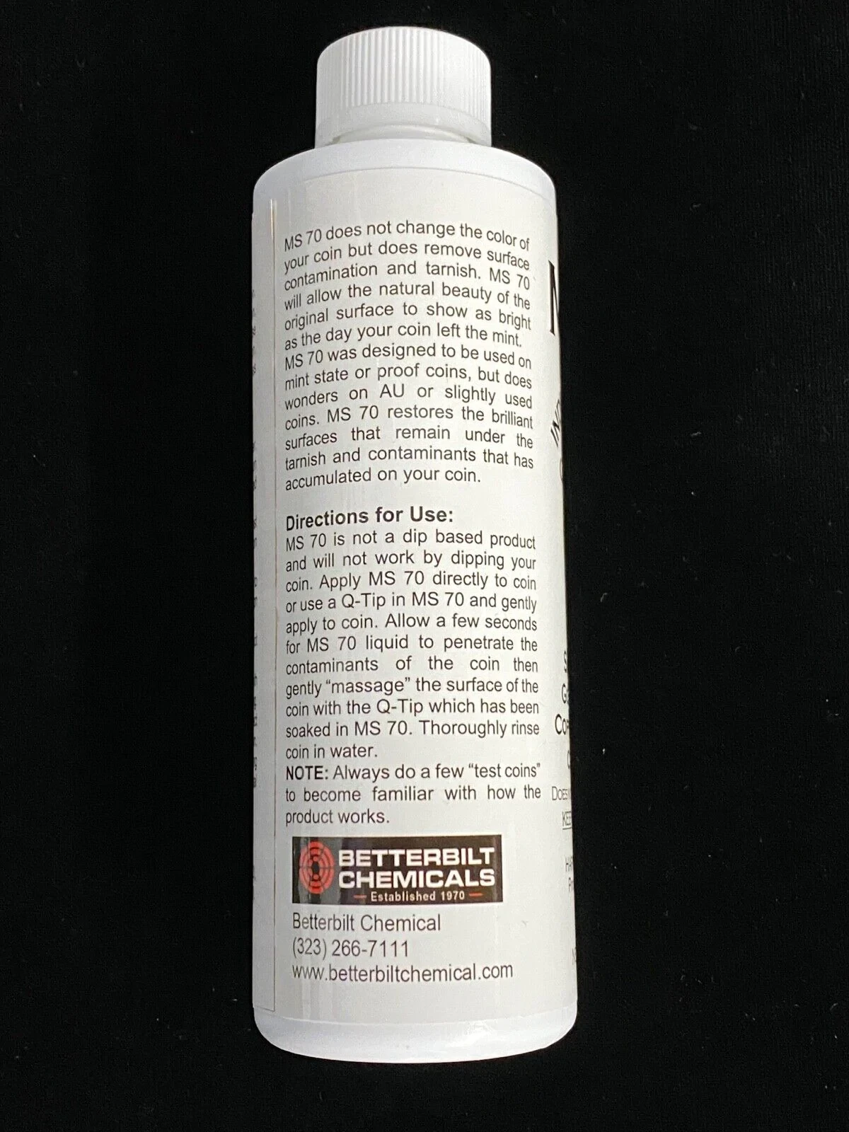 For sale MS 70 8 oz. Bottle Coin Cleaner Brightener for Gold Silver Copper Bronze Brass Nickel Coins. Read all warning and instructions before using MS 70. Open bottles may not be returned. We do not accept any liability resulting from the use of this product. Feel free to contact us with any questions.