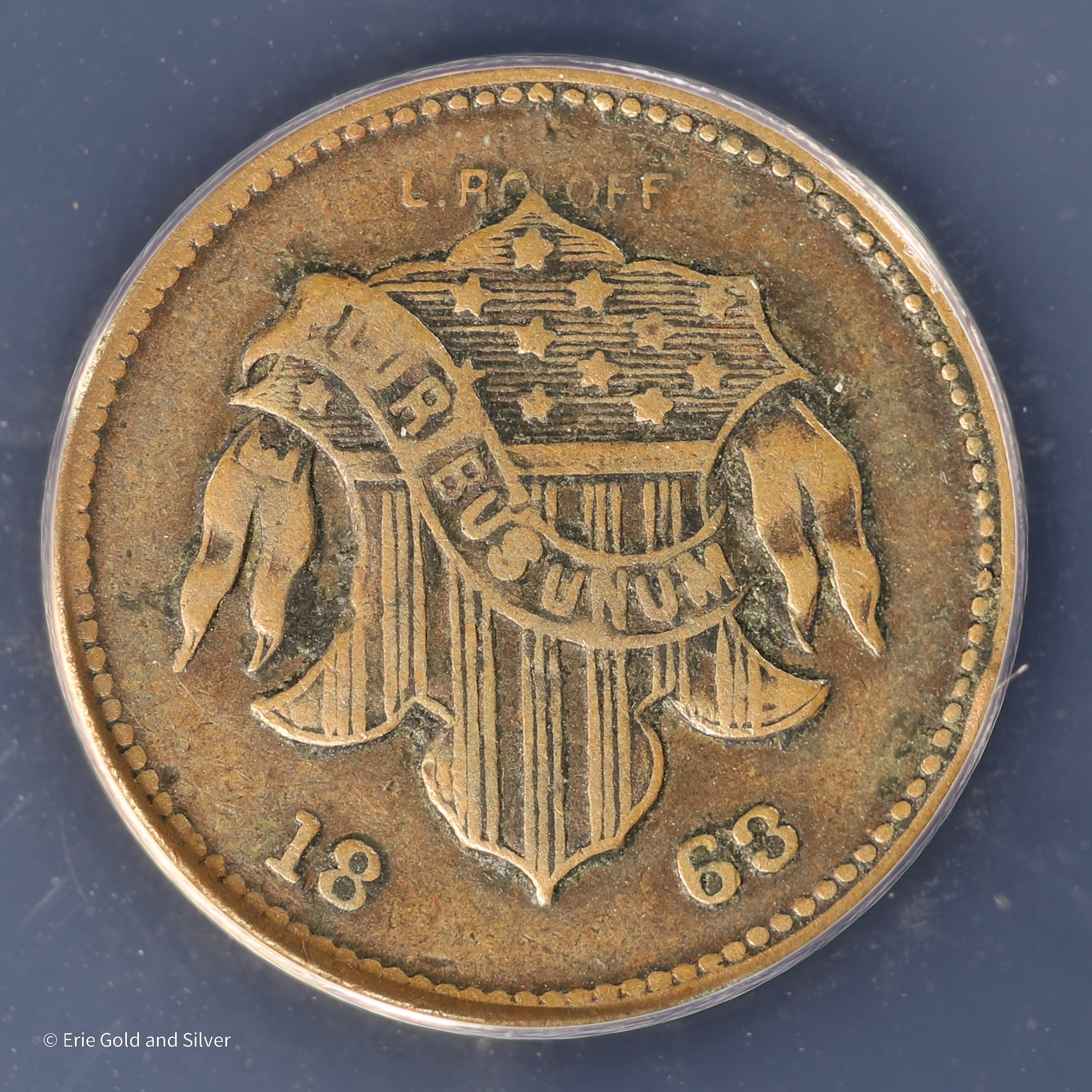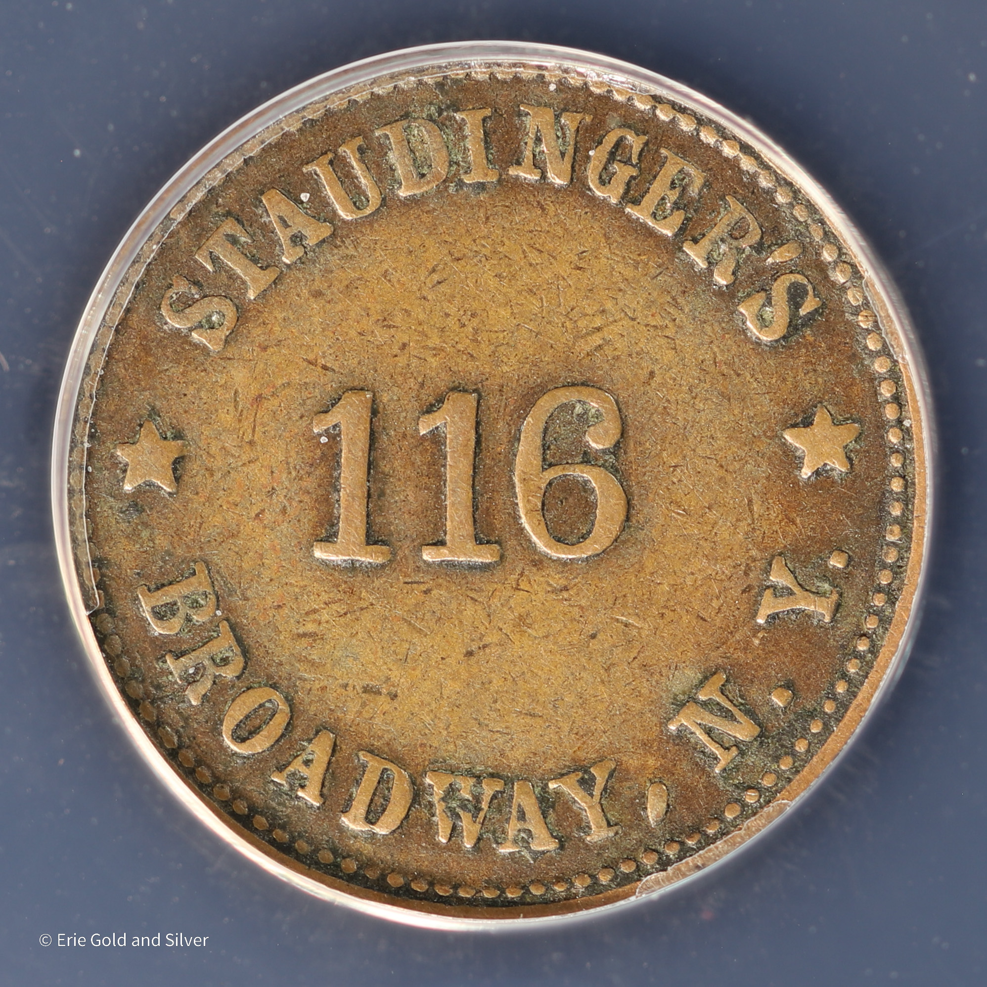 For sale is a copper New York NY- NYC Staudinger's Civil War Storecard Token. Certified / graded by ANACS at VF35.