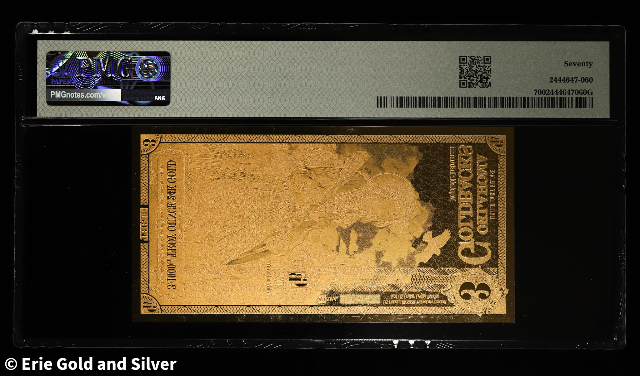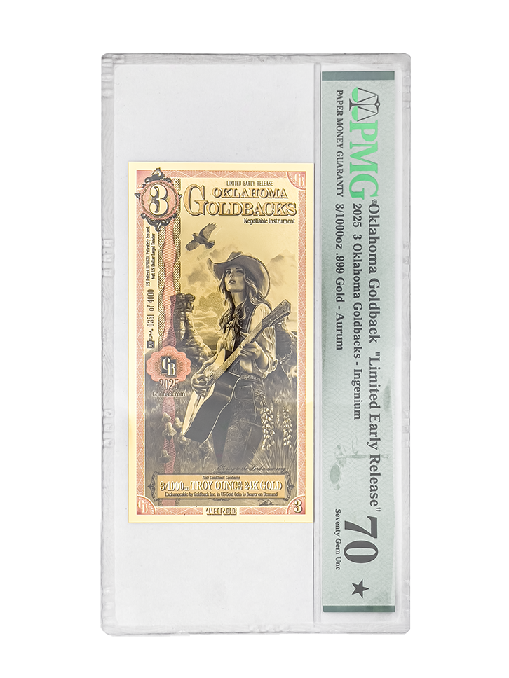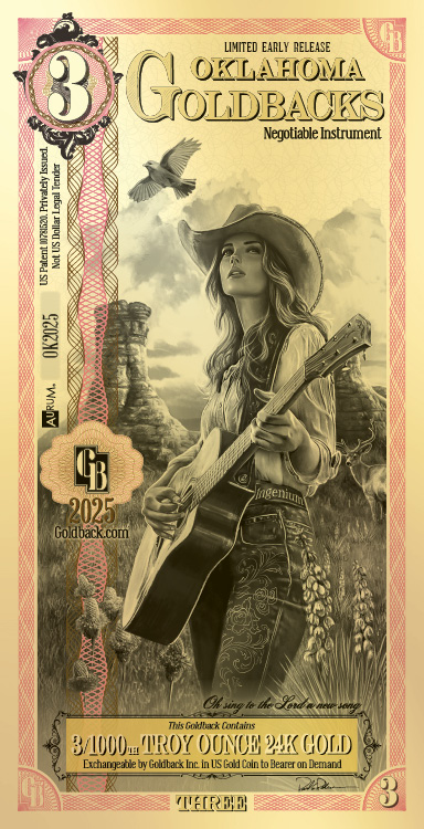 The Oklahoma LER marks the debut of the 3 denomination inspired by the creativity rooted in Oklahoma’s red earth. Set beneath the skies of Black Mesa State Park, the artwork features the virtue Ingenium, who embodies the rich musical legacy of Oklahoma—from Woody Guthrie to Reba McEntire. Surrounded by prairie thistle, yucca, a mule deer, and a soaring Western Tanager, Ingenium represents resilience, strength, and inspiration. Her embroidered jeans feature the Oklahoma Rose, while the inscription below reads, “Oh sing to the Lord a new song.” — Psalm 98:1.