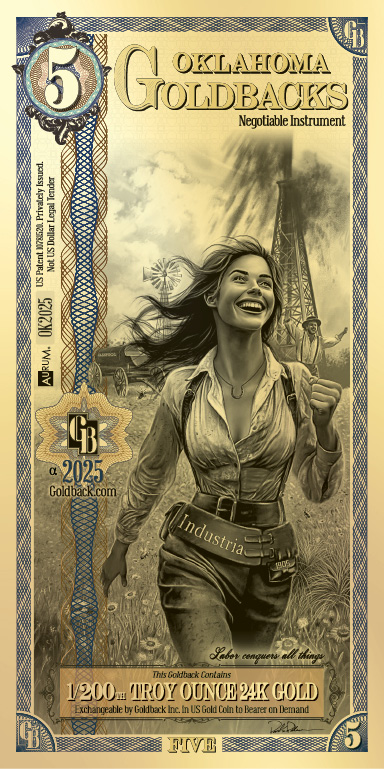 The Oklahoma Goldback is a voluntary, gold-backed currency containing 24-karat gold. Designed for use in Oklahoma, these notes provide a practical way to own and spend real gold. Accepted by participating businesses and sought after by collectors, Goldbacks offer a unique and tangible form of sound money.