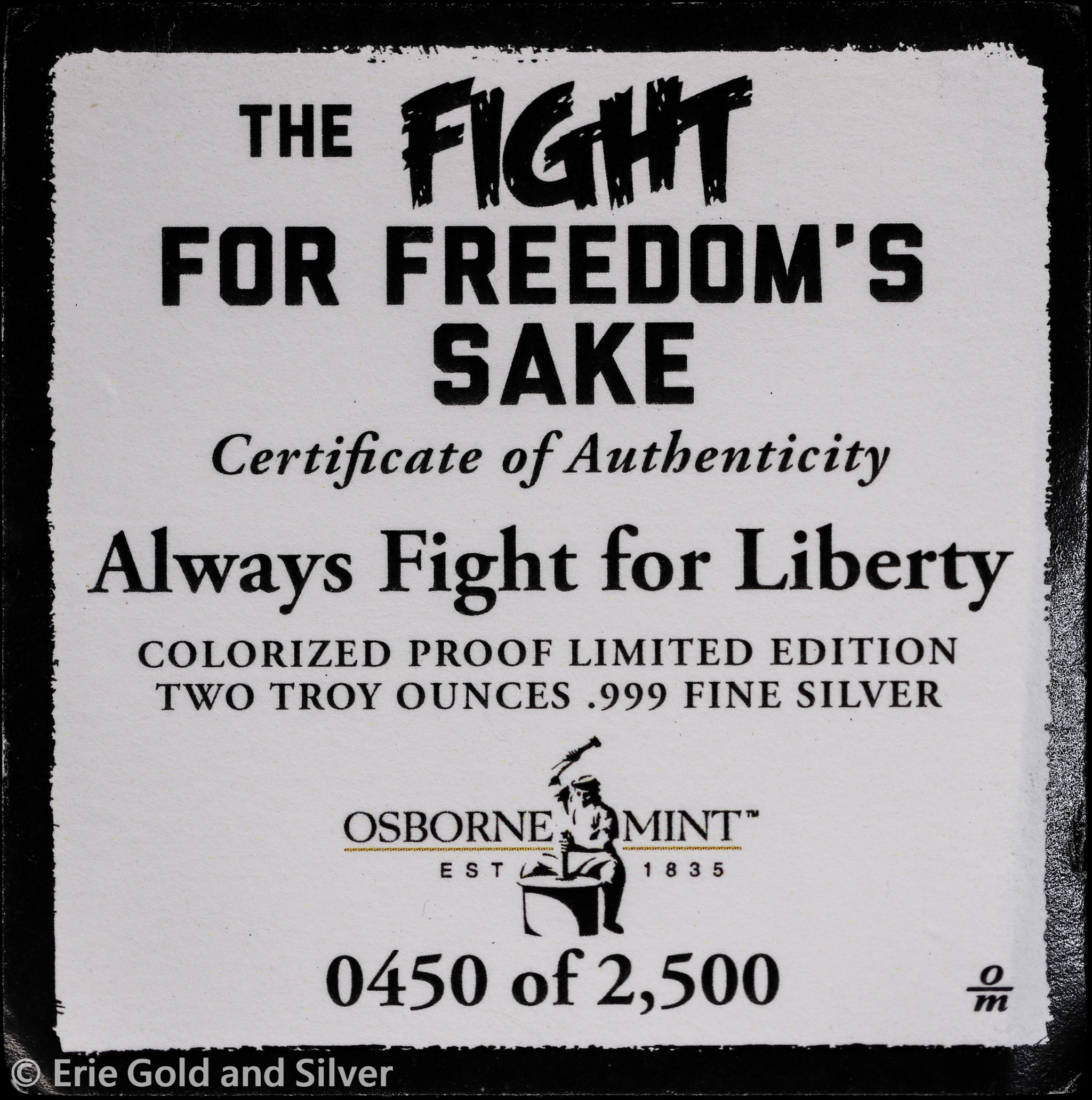 For sale is an Osborne Mint: The Fight for Freedom's Sake - Americans Will Always Fight For Liberty 2 oz Silver Colorized Bar w/ COA.