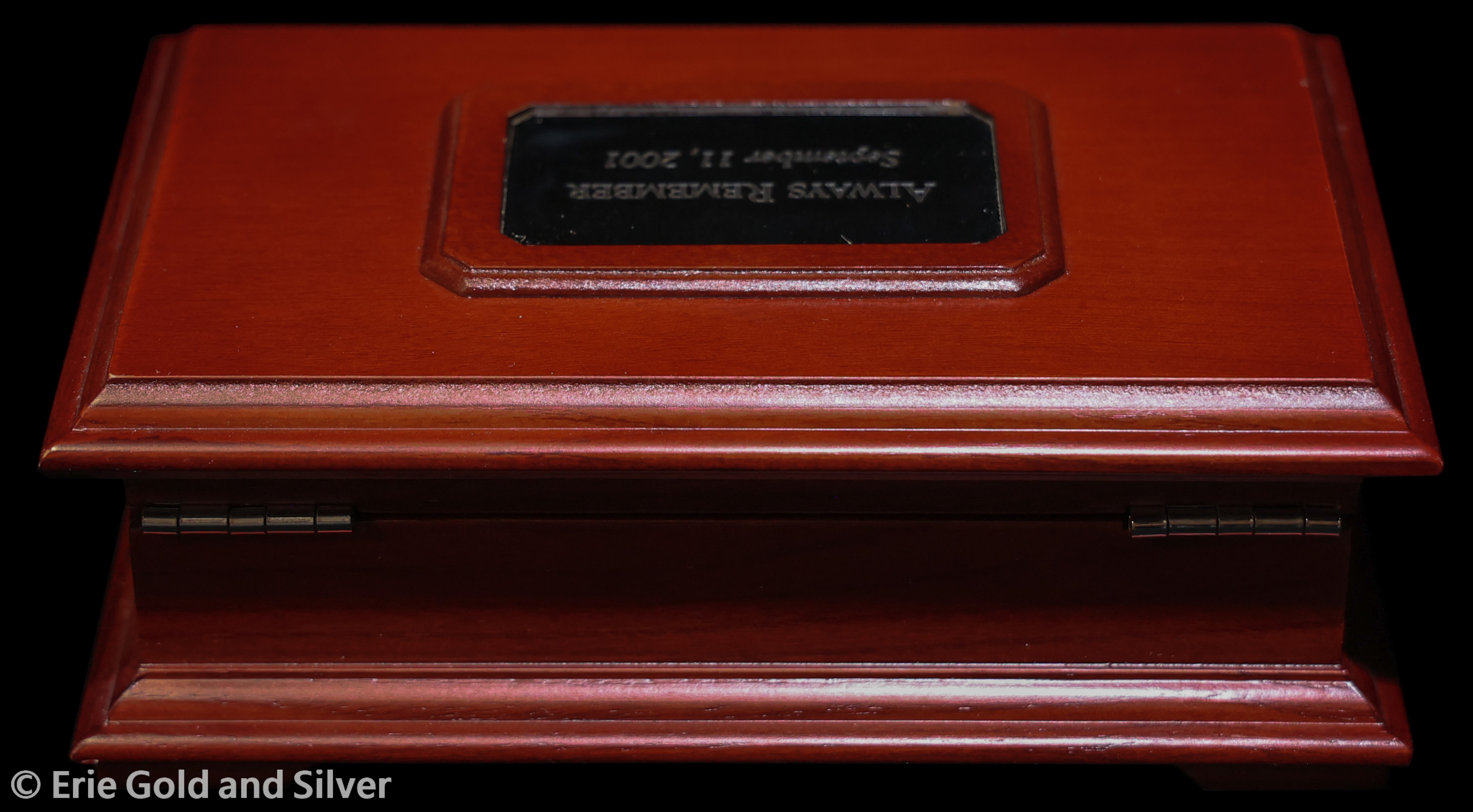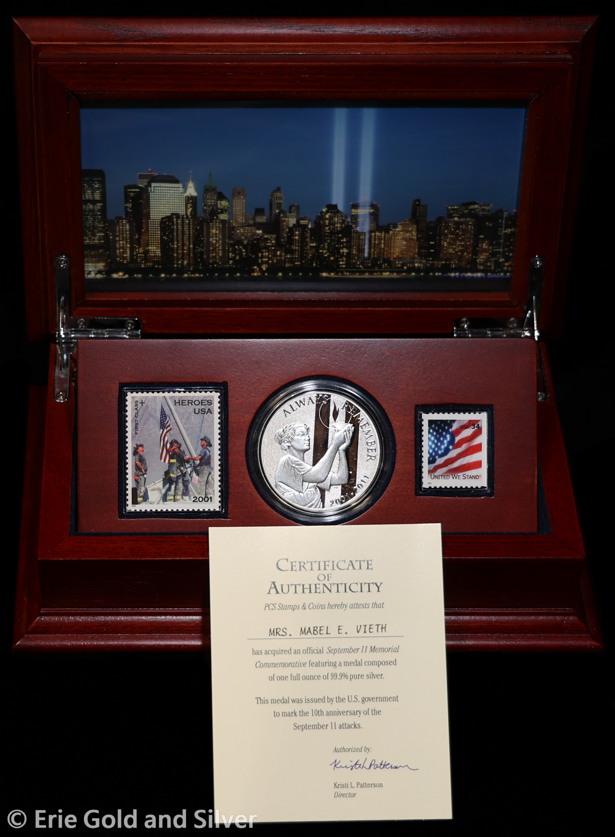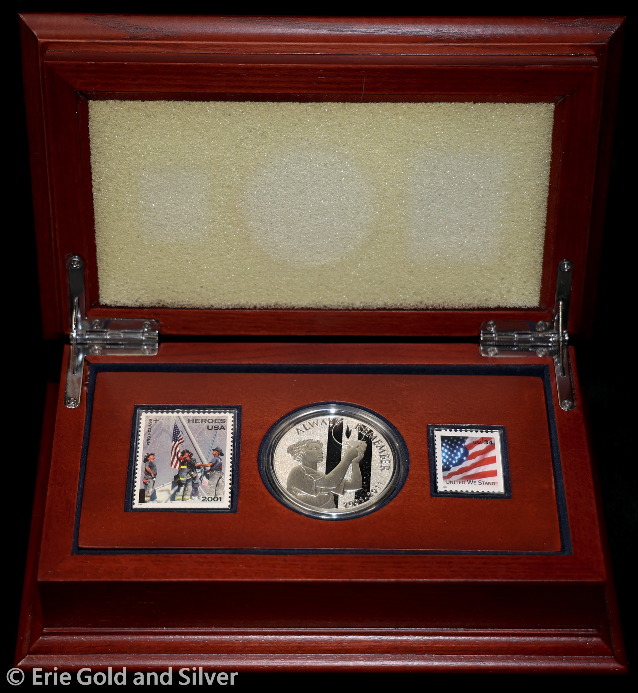 For sale is a PCS September 11 Memorial Commemorative 1 oz Silver Medal & Stamp Set in Wooden Display Box.