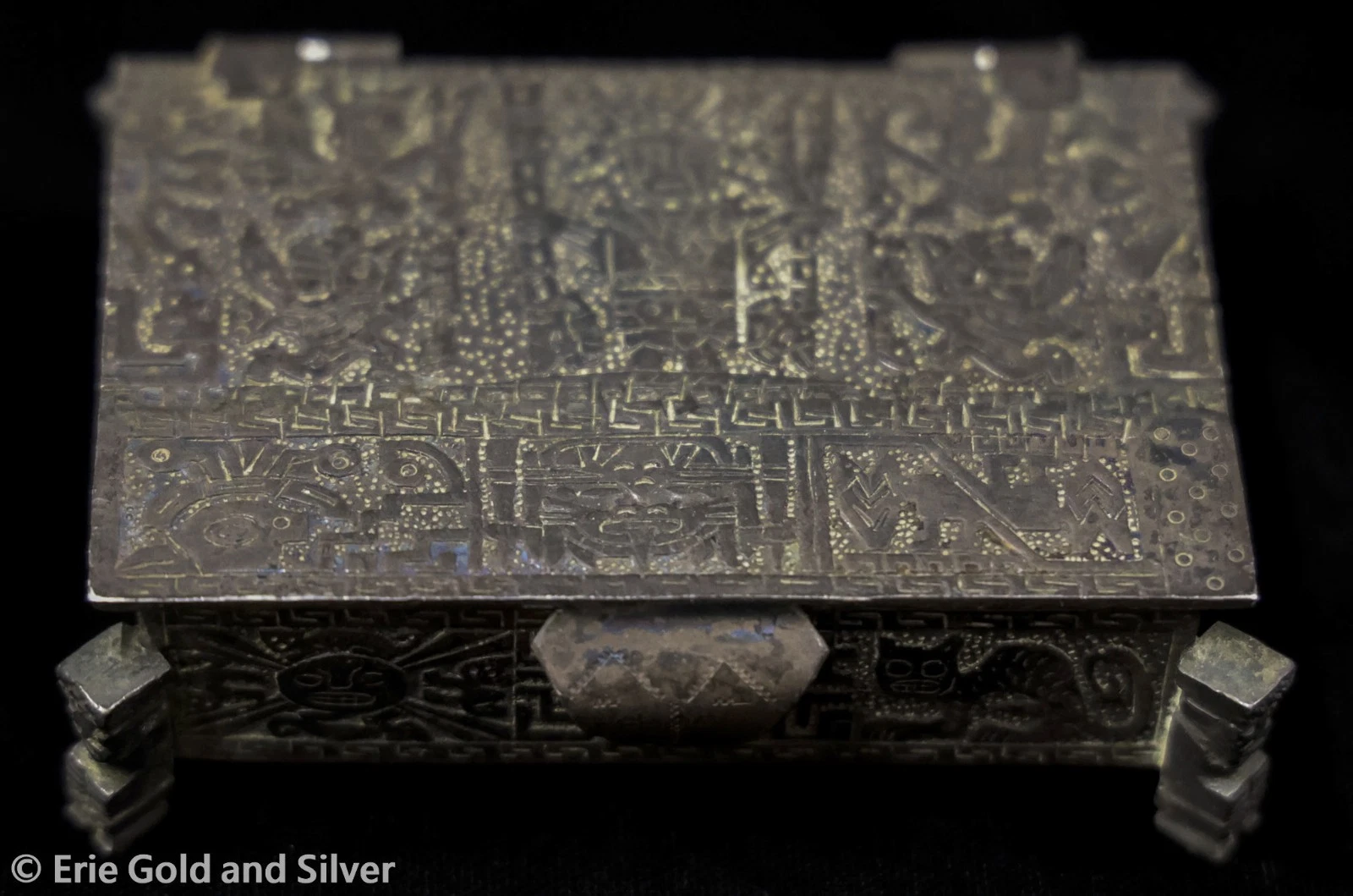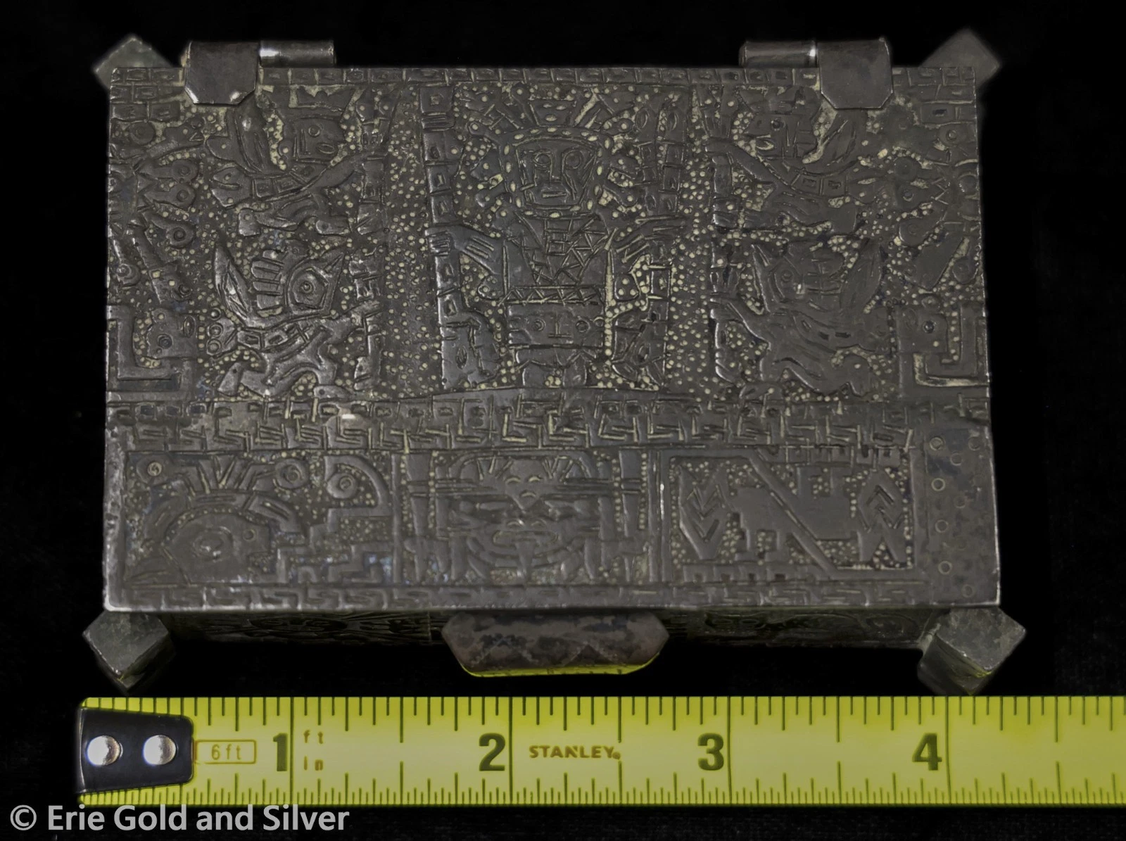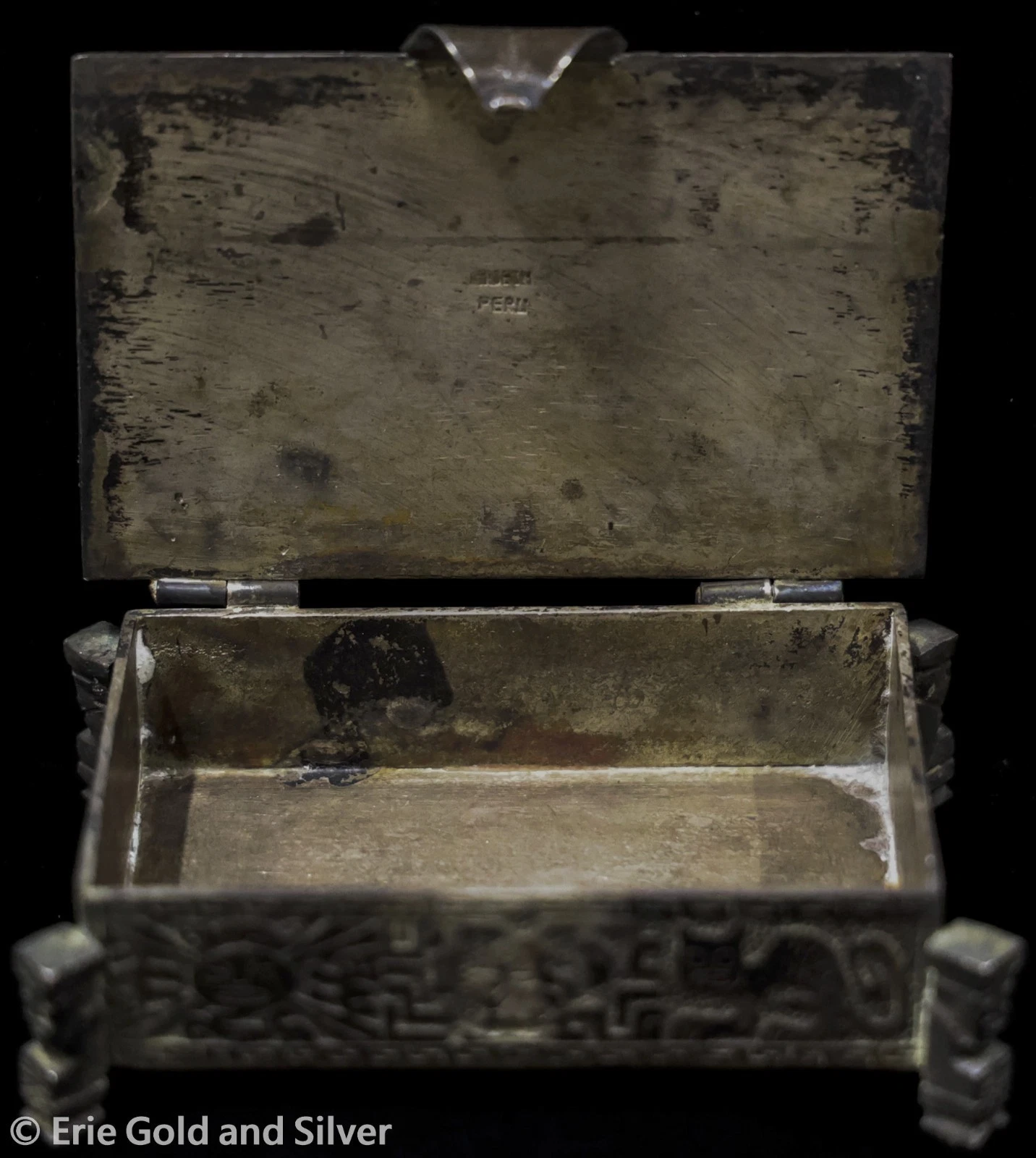 For sale is a Peru Ornate Aztec Mayan 900 Silver Footed Jewelry Box.
