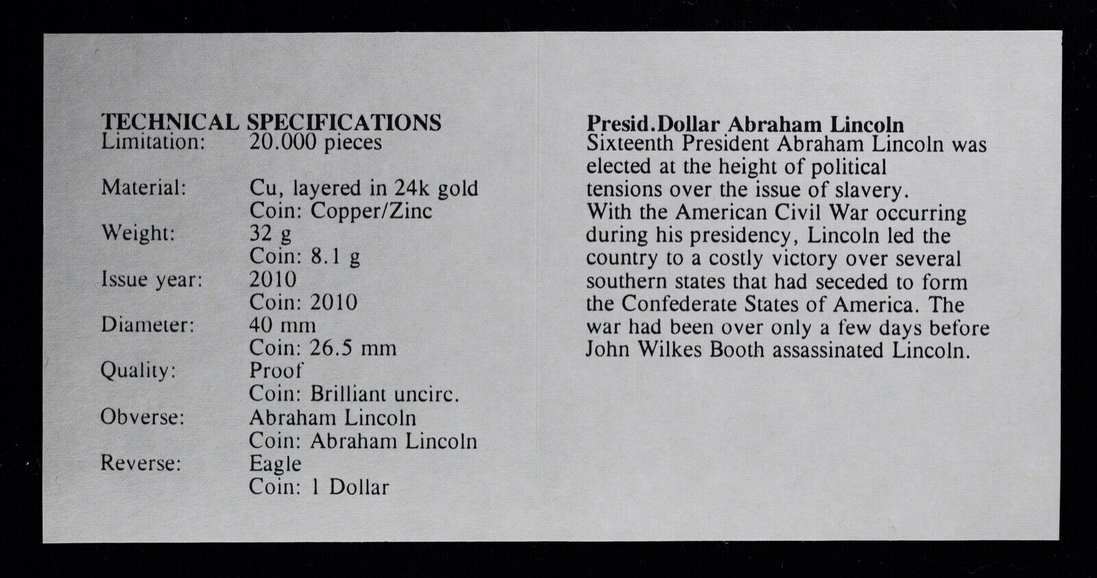 For sale is a Presidential Proof Set With COA- Abraham Lincoln Issued in 2010 American Mint View pictures for details and condition, the coin pictured is the exact coin you will receive. Feel free to contact us with any questions.