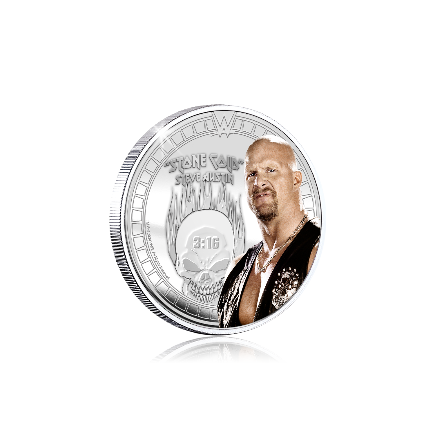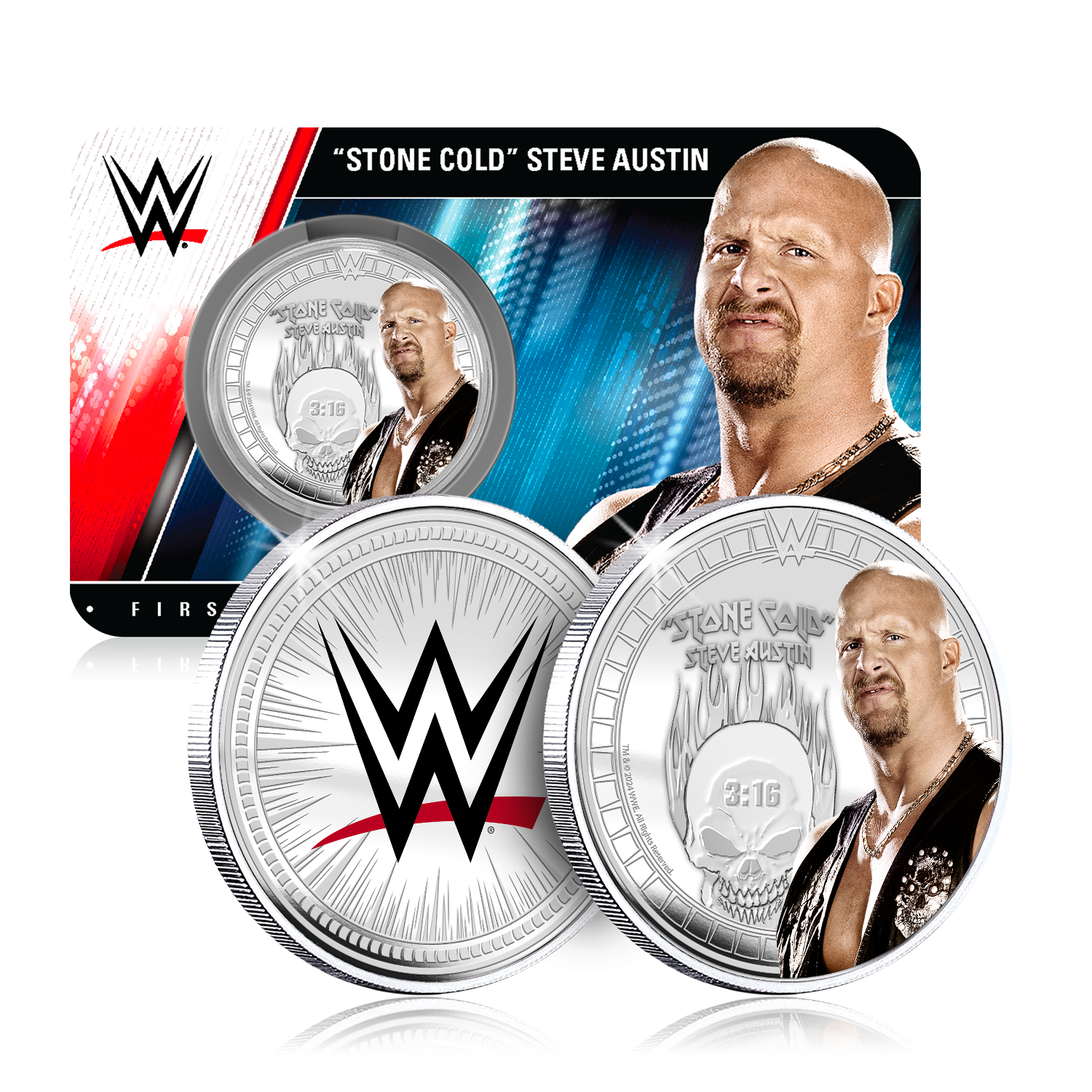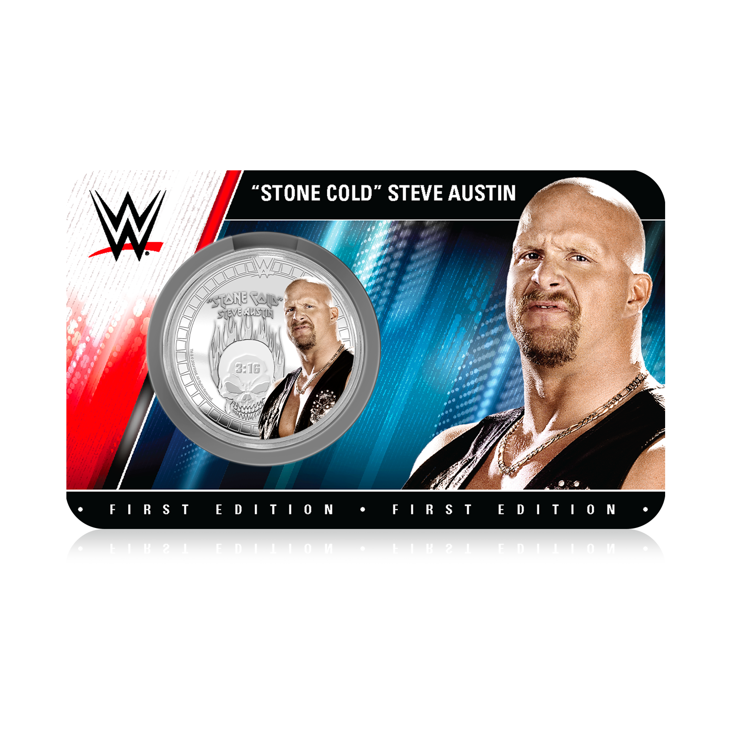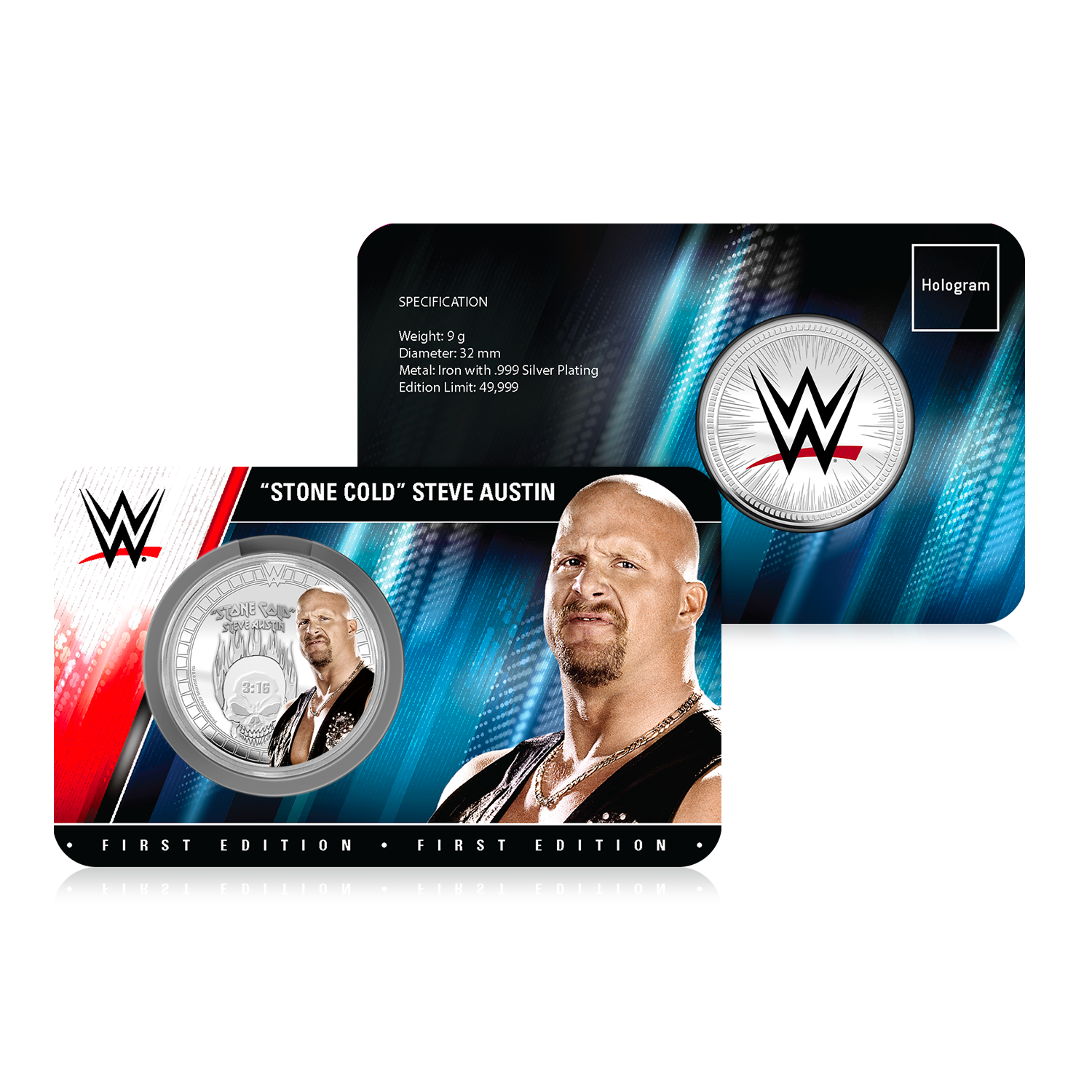 For sale is a “Stone Cold” Steve Austin WWE Legends First Edition .999 Silverplated Medallion in card. View pictures for details and condition."Stone Cold" Steve Austin is a WWE legend who defined the Attitude Era with his rebellious, anti-authority persona, becoming a six-time WWE Champion and one of the biggest stars in wrestling history. His iconic feuds, especially with Vince McMahon, and his signature "Austin 3:16" catchphrase helped revolutionize WWE, making him a pop culture icon."And that's the bottom line, because Stone Cold said so!"-Steve Austin.