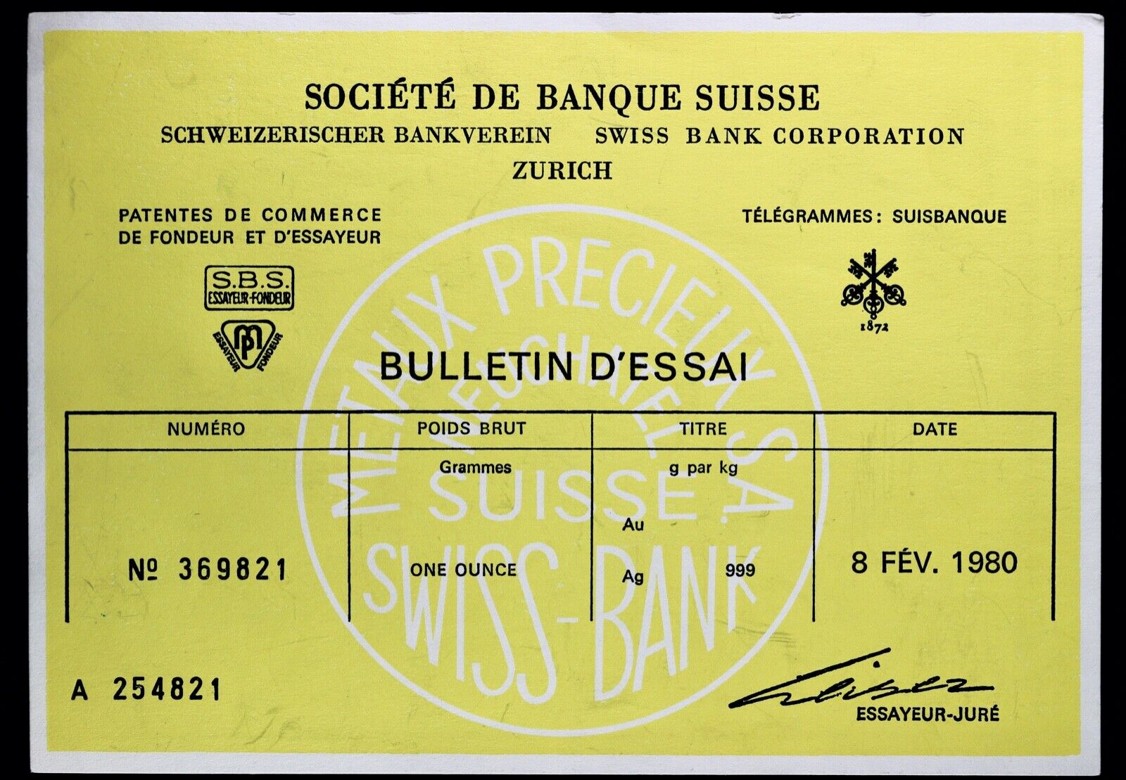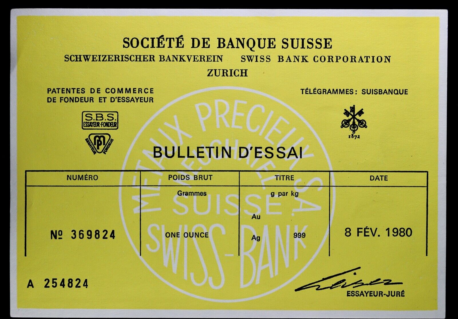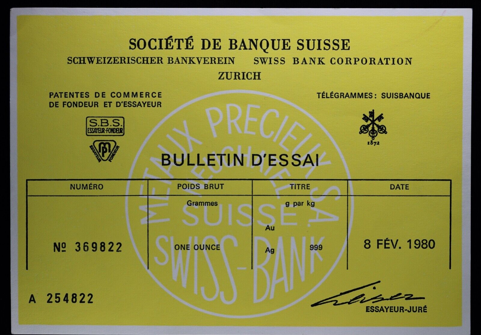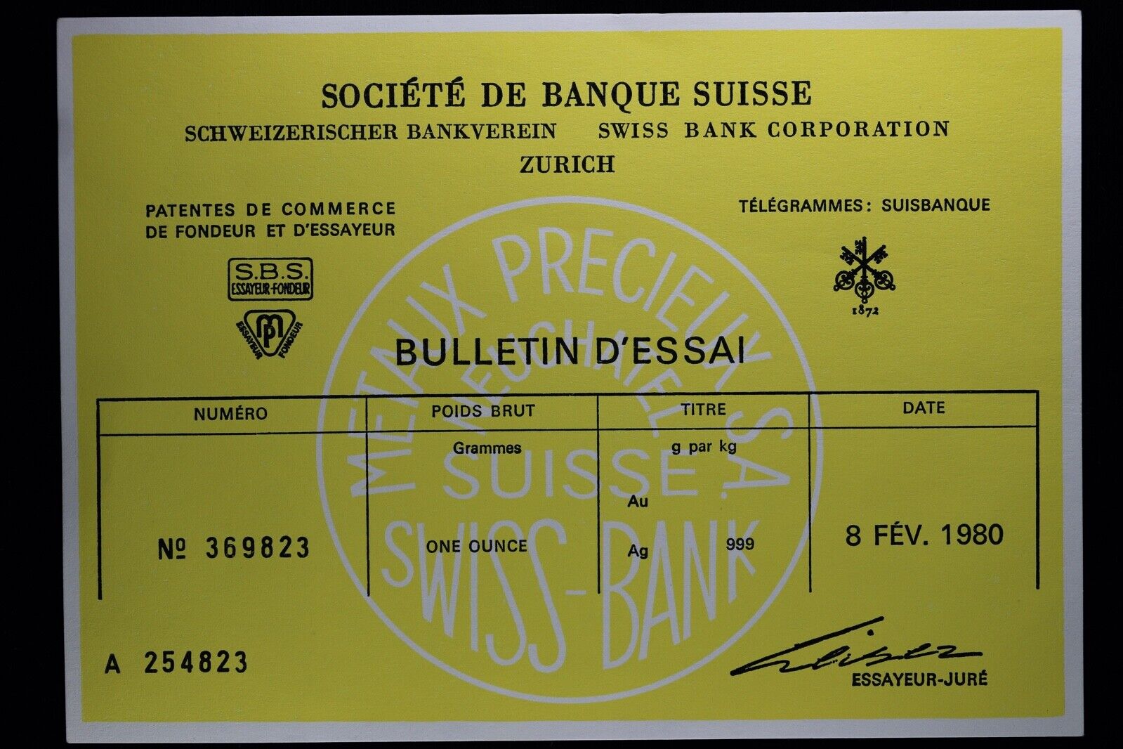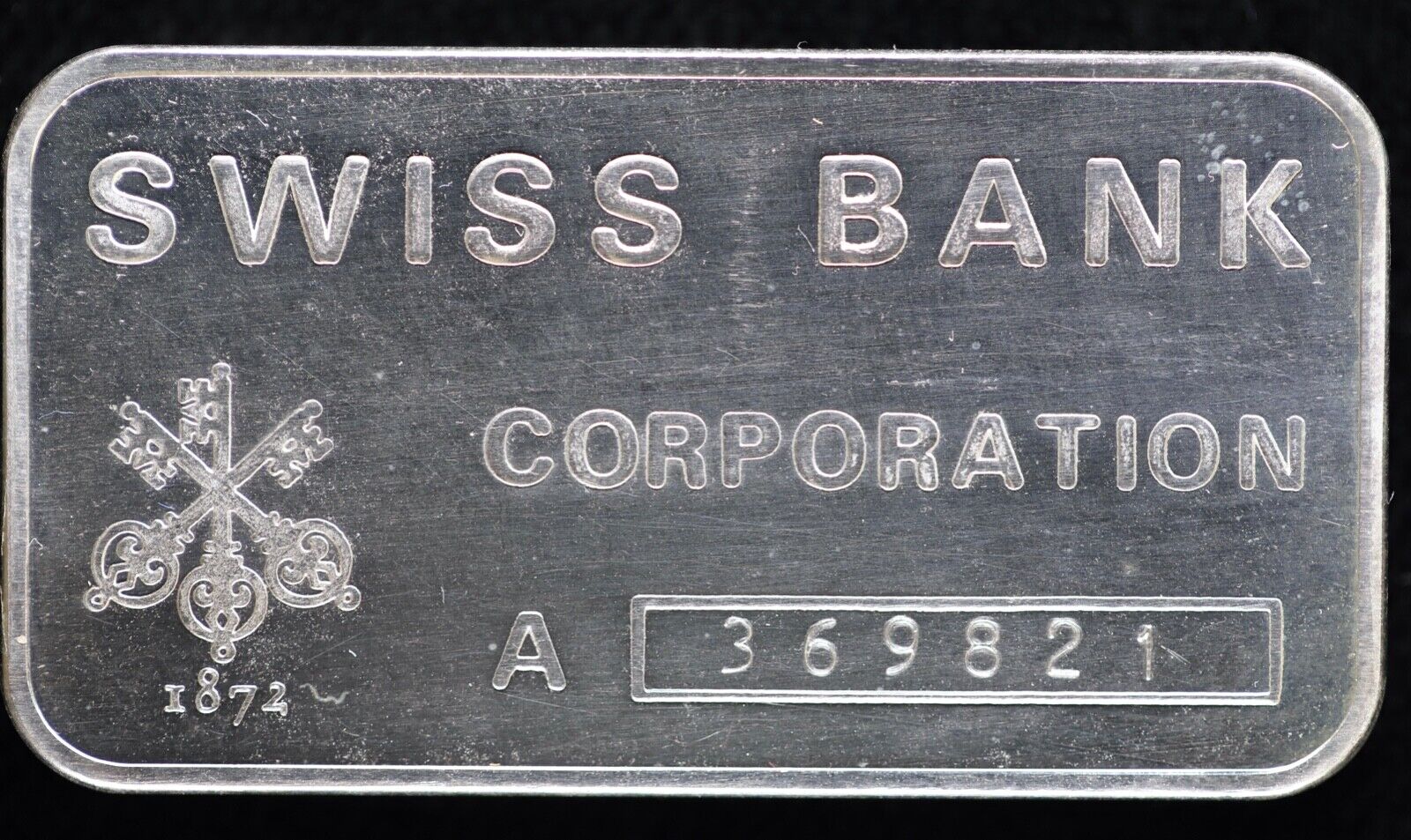 Swiss Bank Corporation 1 oz .999 Fine Silver Vintage Bar with COA