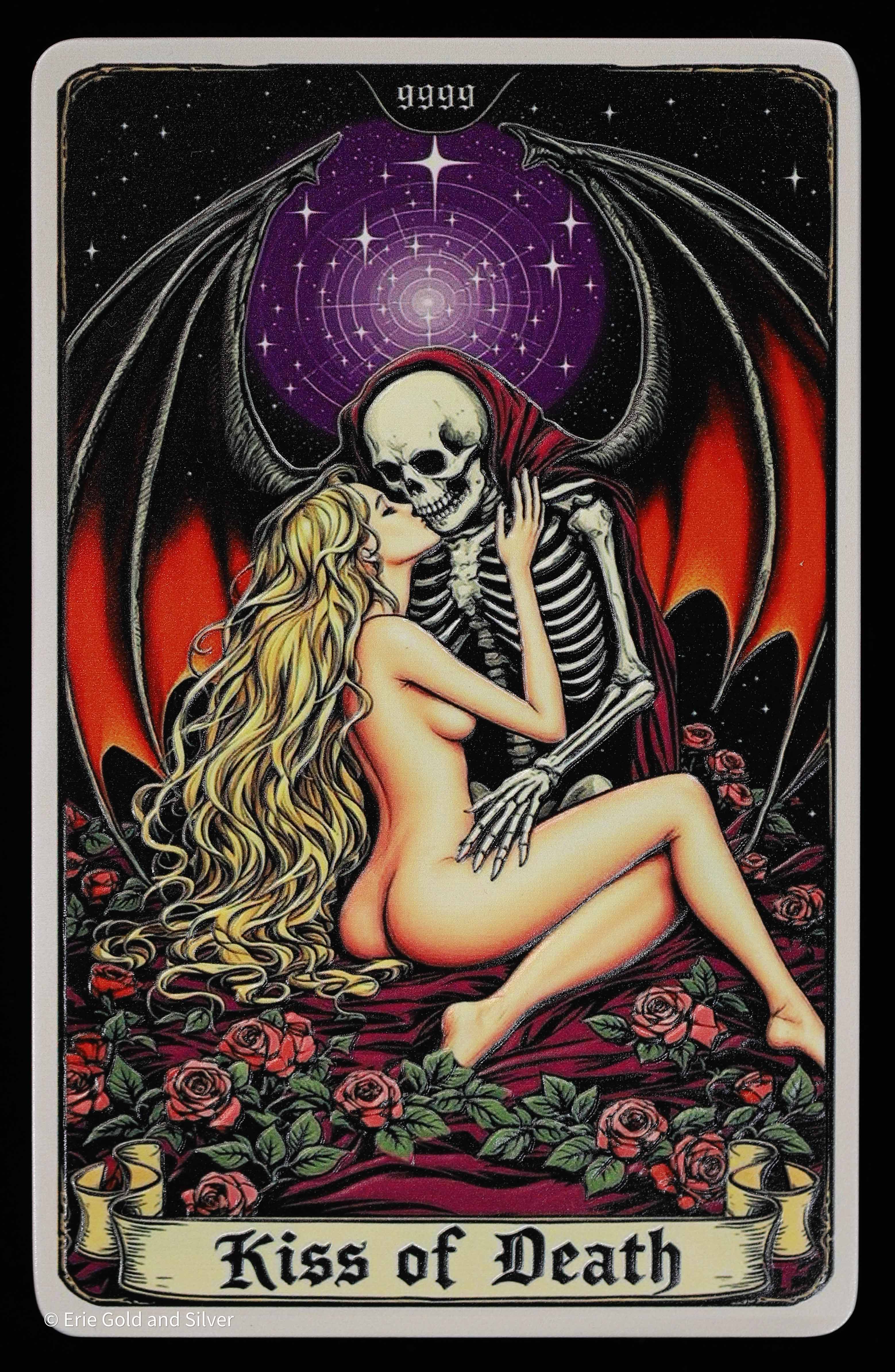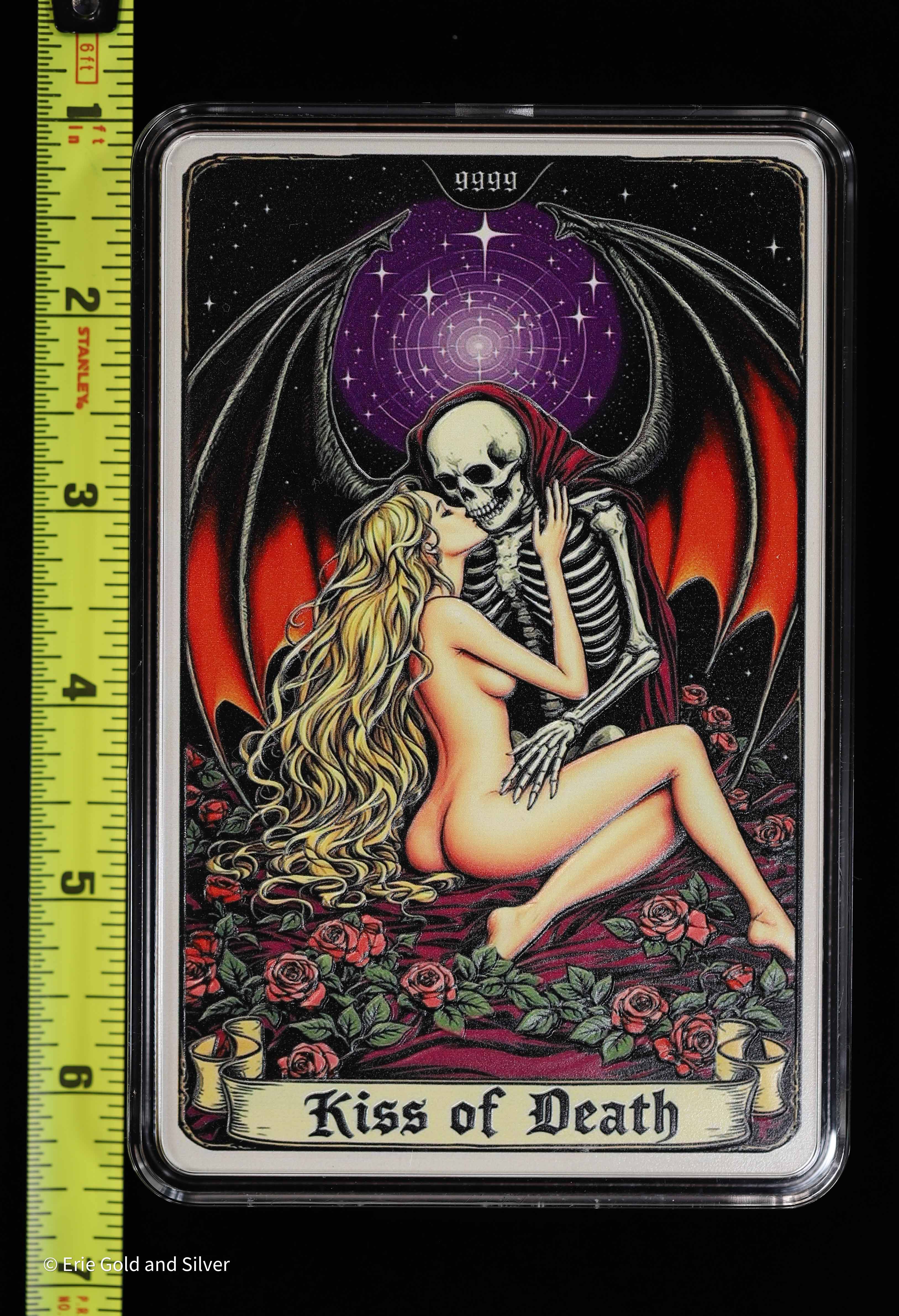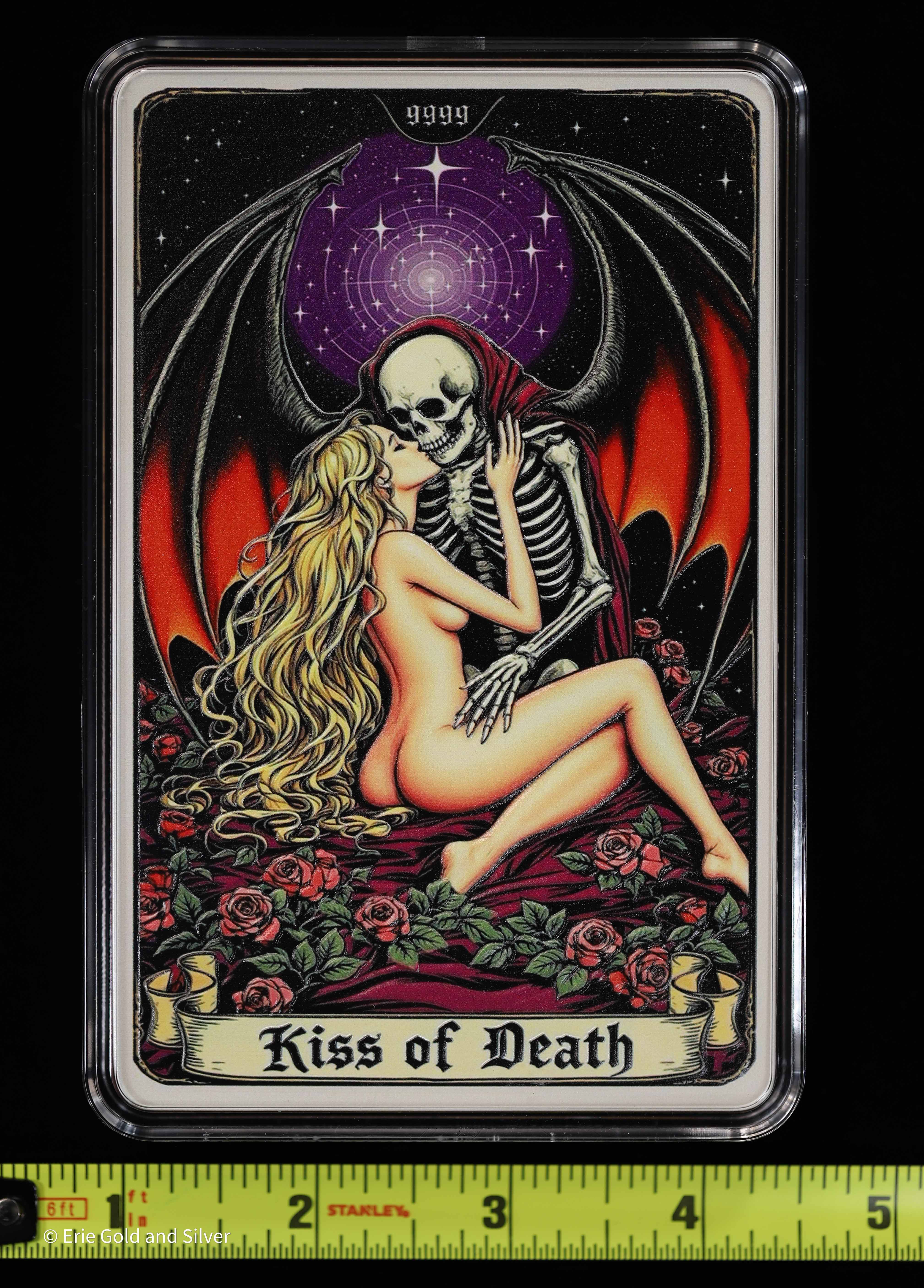 This Torocard Kiss of Death bar contains 1 kilo of copper and features a colorized design, presented in a protective capsule. Combining bold artwork with substantial weight, this piece is well suited for collectors of large-format copper bars, Torocard issues, and modern art-themed bullion collectibles.